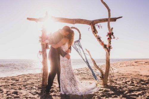 A perfect kiss beneath a driftwood altar.